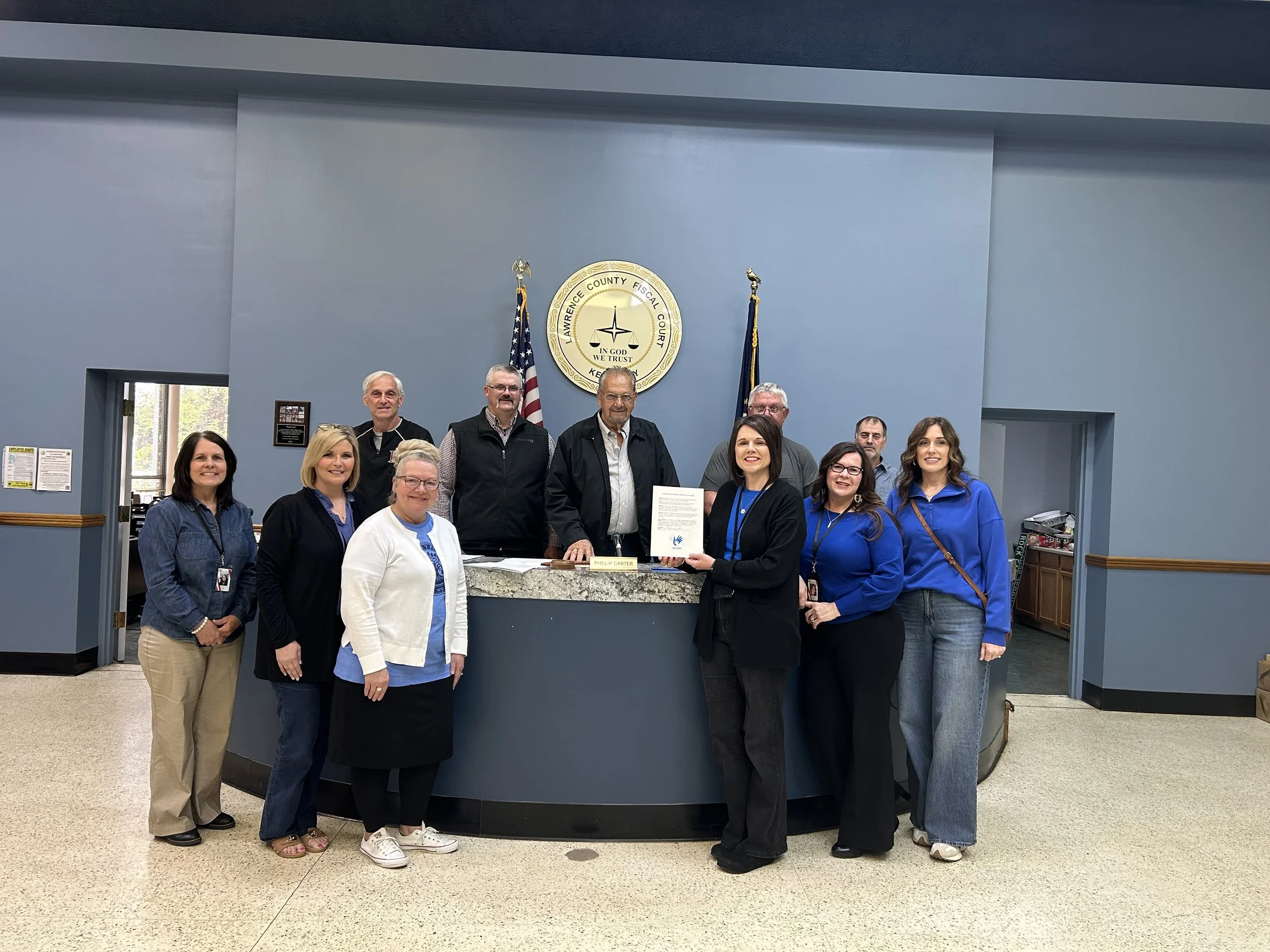 FAMILY RESOURCE representatives from each school in the Lawrence County District attended the Lawrence County Fiscal Court meeting on Tuesday, April 21, to witness LC Judge Executive signing a proclamation declaring April 2026 as Child Abuse Prevention Month. BSN photo by Roberta Cantrell