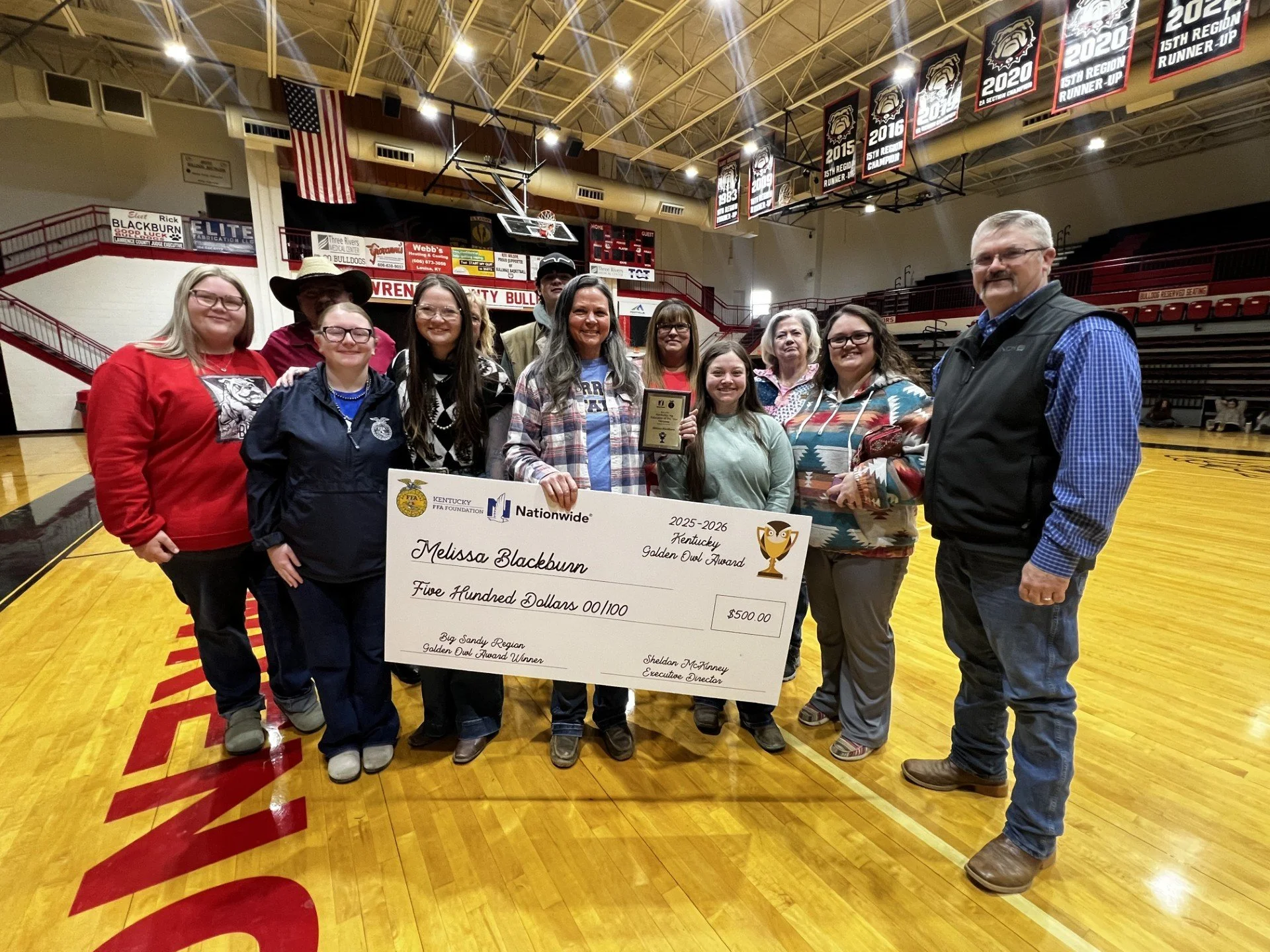LCHS Agriculture teacher Melissa Blackburn was recognized on Wednesday, Feb. 25, as the Big Sandy River Region Nominee for the Golden Owl Award! The Golden Owl Award is awarded to the state’s top agriculture teachers, with nominations collected from local students, parents, fellow teachers and community members. Blackburn was presented with a personalized plaque and received a $500 check from Ms. Sheldon McKinney, Executive Director of the KY FFA Foundation.