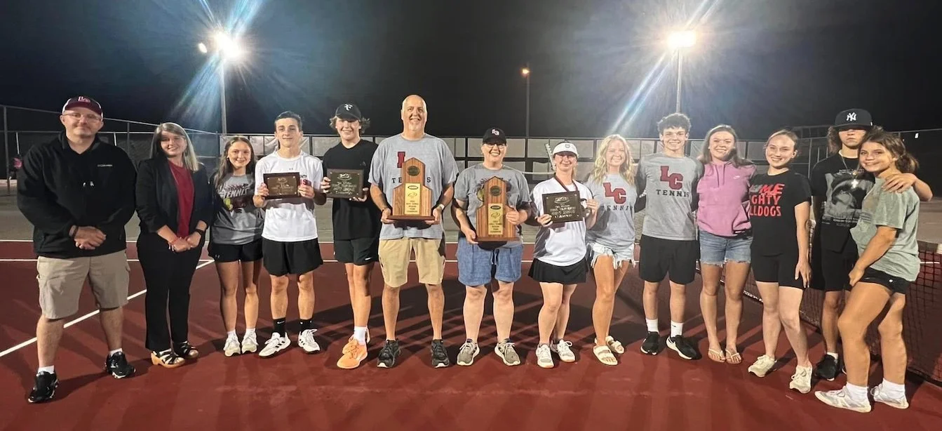 Winning on its home court, Lawrence County swept the 15th Region tennis titles, Thursday, May 18. Superintendent Dr. Robbie Fletcher, LCHS Principal Myram Brady, Molly McClanahan, Blake Maynard, Chase Kendrick, Head Coach Joey McClanahan, Assistant Coach, Sarah Simpson, Kennedy Gauze, Riley McClanahan, Alex DeSario, Hannah May, Hannah Delong, Alex Frazier and Lexi Frazier accepting their trophies. Photo courtesy of Lawrence County High School